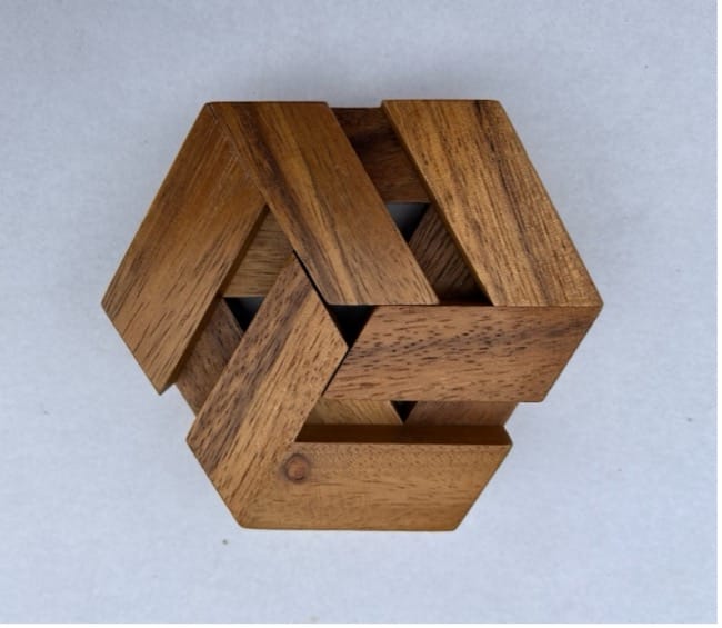 A wooden puzzle that comes apart with a gentle touch but resists when pressure is applied
