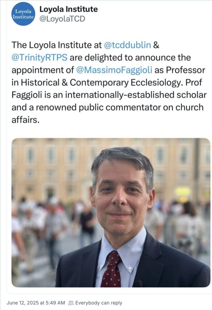 You are no doubt familiar with the work of Prof. Massimo Faggioli, hitherto of Villanova University. You may also be aware of his appointment to the faculty of the Loyola Institute at Trinity College Dublin, which has just been announced.