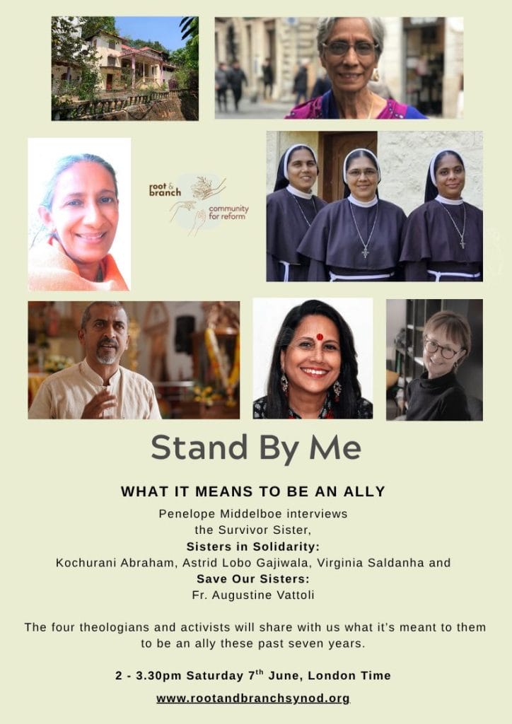 | You may well remember the case a few years back. Here’s our update. A former Superior General of a small diocesan congregation (order of religious sisters) in the Punjab, India, bravely disclosed that her bishop had raped and sexually abused her multiple times. From that moment on her life has been a nightmare. The abuse happened after her three terms as Superior General, when she was the Superior of one of the congregation’s convents in Kerala. She wrote many times to the Church authorities in India and at the Vatican asking for intervention. Even though the official Church response was silence, her family was threatened and bribed. After waiting more than a year she eventually filed the case with the police. For Stand By Me we’ve invited three members of Sisters in Solidarity (SIS) who offer practical, spiritual and emotional support to the Survivor and her religious sister companions, and an activist priest from Save Our Sisters (SOS). These are co-founders Kochurani Abraham, Astrid Lobo Gajiwala and Virginia Saldanha. All three are from the Indian Women Theologians Forum (a collective of feminist theologians) and they have been walking with the Survivor and her companions since she went public in 2018. They, and activist priest Fr Augustine Vattoli, will share with us what it’s meant to them to be an ally these past seven years. We will not discuss the case because it is sub judice. Penelope Middelboe and husband Jon Rosebank, who travelled to see the Survivor and her companions with Kochurani in February this year, will introduce our gathering. We will hear from the Survivor what it’s meant to find support from so many people when her own congregation and diocese and the local parish has responded with silence or intimidation. We are deeply grateful to Survivor Sister and her allies for giving us this chance to truly Stand By Me. |